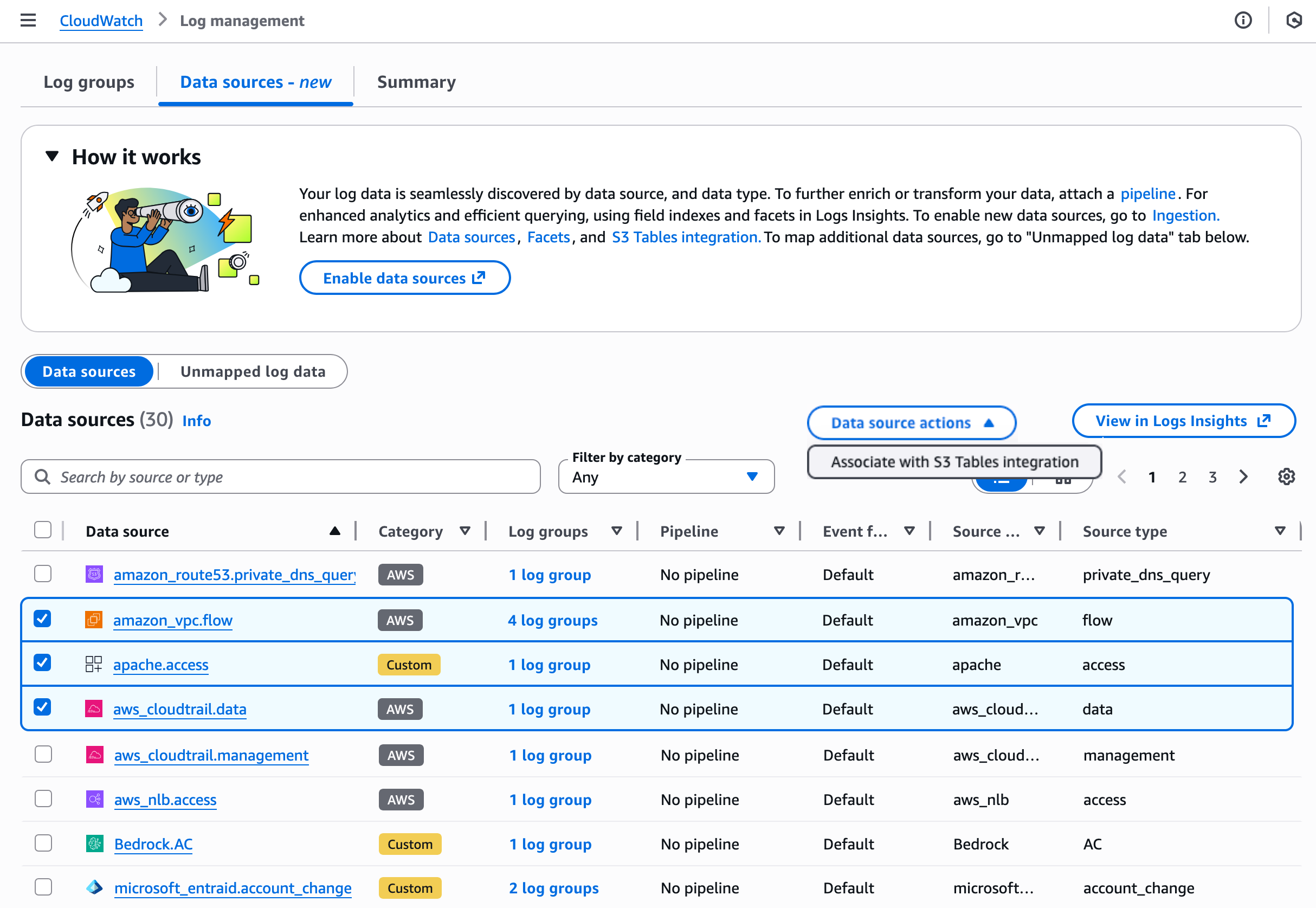 Elige el Acciones de origen de datos para integrar tablas S3 para realizar registros futuros para fuentes de datos seleccionadas. Tiene la flexibilidad de analizar los registros a través de Athena y Amazon Redshift y otros motores de consulta como Spark utilizando patrones de acceso compatibles con Iceberg. Con esta integración, los registros de CloudWatch están disponibles en formato de solo lectura aws-cloudwatch Cubo de mesas S3.