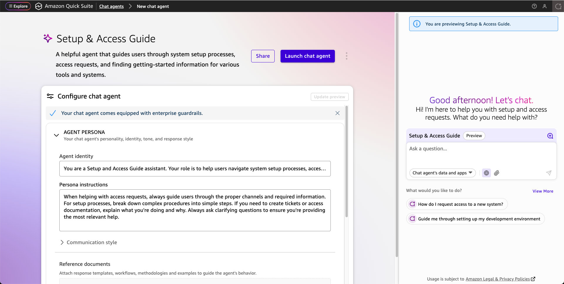 Agentes de chat – Quick Suite incluye agentes de información que puede utilizar para interactuar con sus datos y flujos de trabajo a través del lenguaje natural. Quick Suite incluye un agente integrado para responder preguntas sobre todos sus datos y agentes de chat personalizados que puede configurar con experiencia y contexto empresarial específicos. Los agentes de chat personalizados se pueden adaptar a departamentos o casos de uso específicos, como un agente de ventas conectado a los datos de su catálogo de productos y a la información de precios almacenada en un espacio o un agente de cumplimiento configurado con sus requisitos y acciones regulatorias para solicitar aprobaciones.