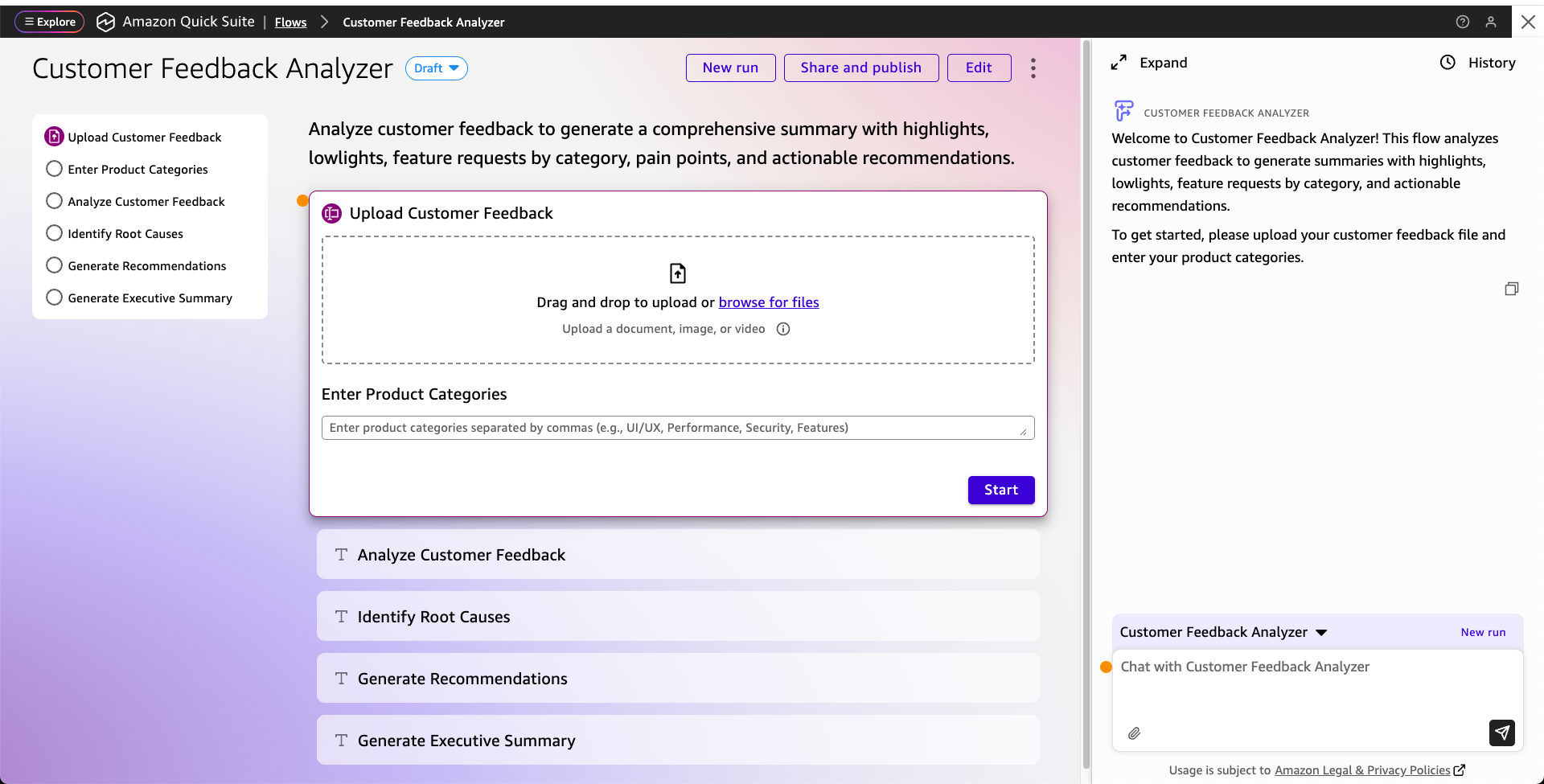 Una vez configurado el flujo, puede compartirlo con un solo clic con sus compañeros de trabajo y otros equipos. Para ejecutar el flujo, los usuarios pueden abrirlo desde la biblioteca o invocarlo desde el chat, proporcionar las entradas necesarias y luego chatear con el agente para refinar los resultados y personalizar aún más los resultados.
