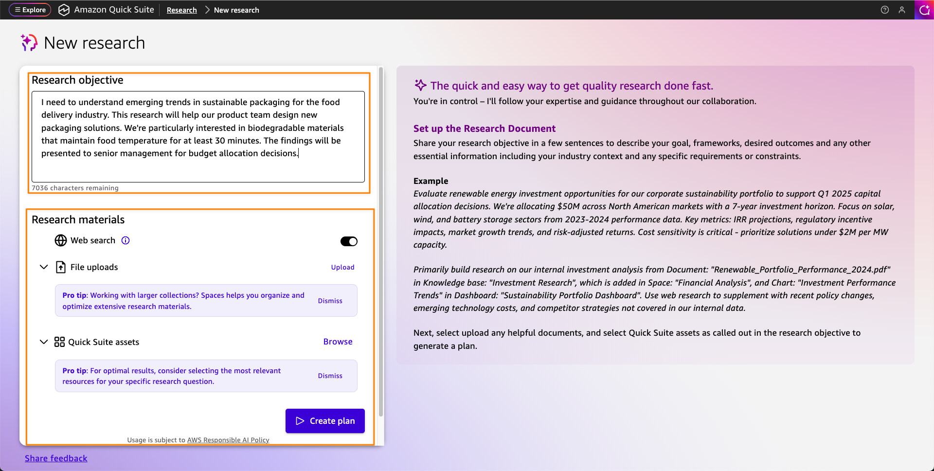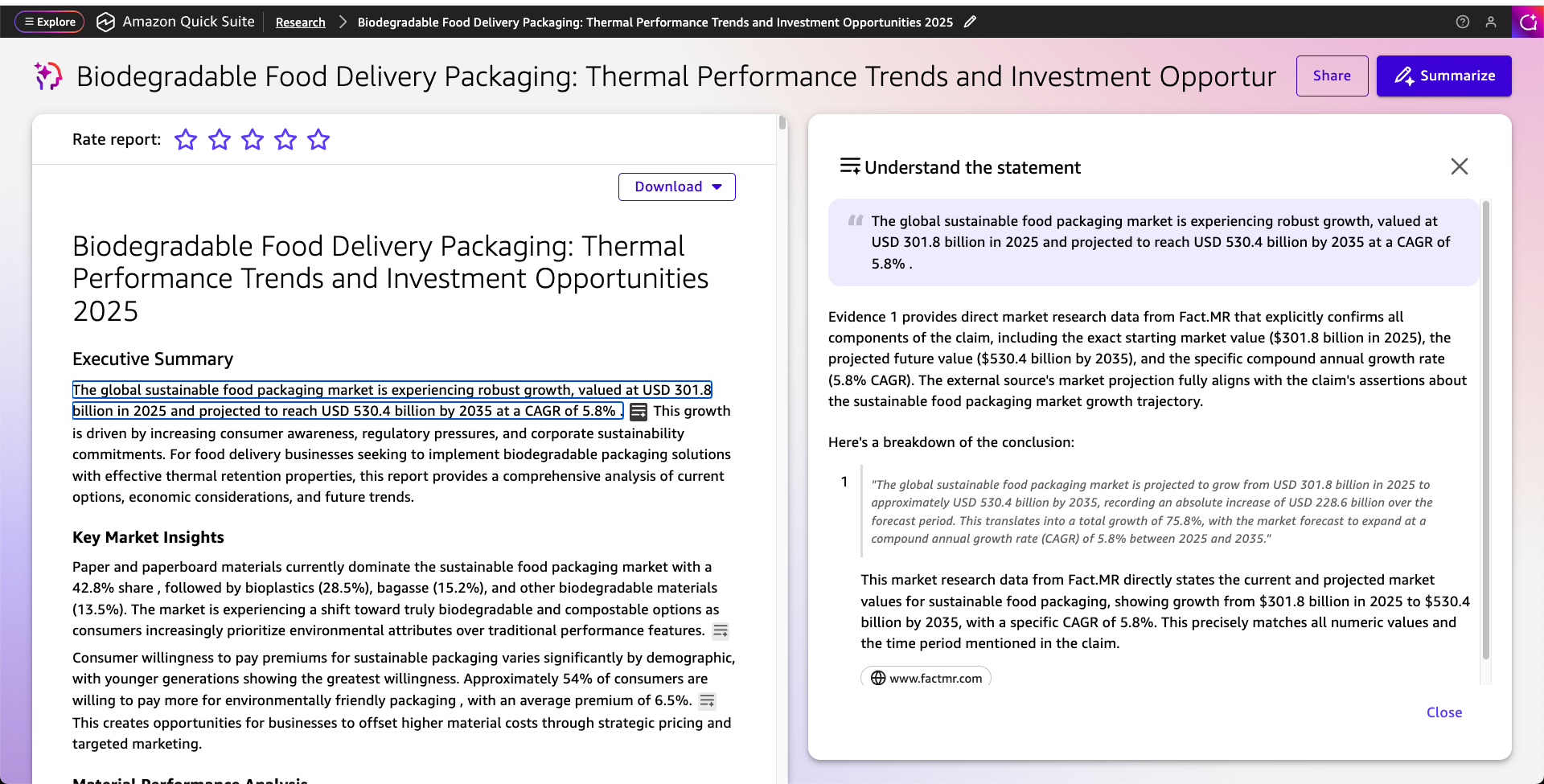 Quick Research se integra con los datos de su empresa conectados a Quick Suite, la base de conocimiento unificada que se conecta a sus paneles, documentos, bases de datos y fuentes externas, incluidos Amazon S3, Snowflake, Google Drive y Microsoft SharePoint. Quick Research basa los conocimientos clave en fuentes originales y revela rutas de razonamiento claras, lo que le ayuda a verificar la precisión, comprender la lógica detrás de las recomendaciones y presentar los hallazgos con confianza. Puede rastrear los hallazgos hasta sus fuentes originales y validar las conclusiones mediante citas de fuentes. Esto lo hace ideal para temas complejos que requieren un análisis en profundidad.