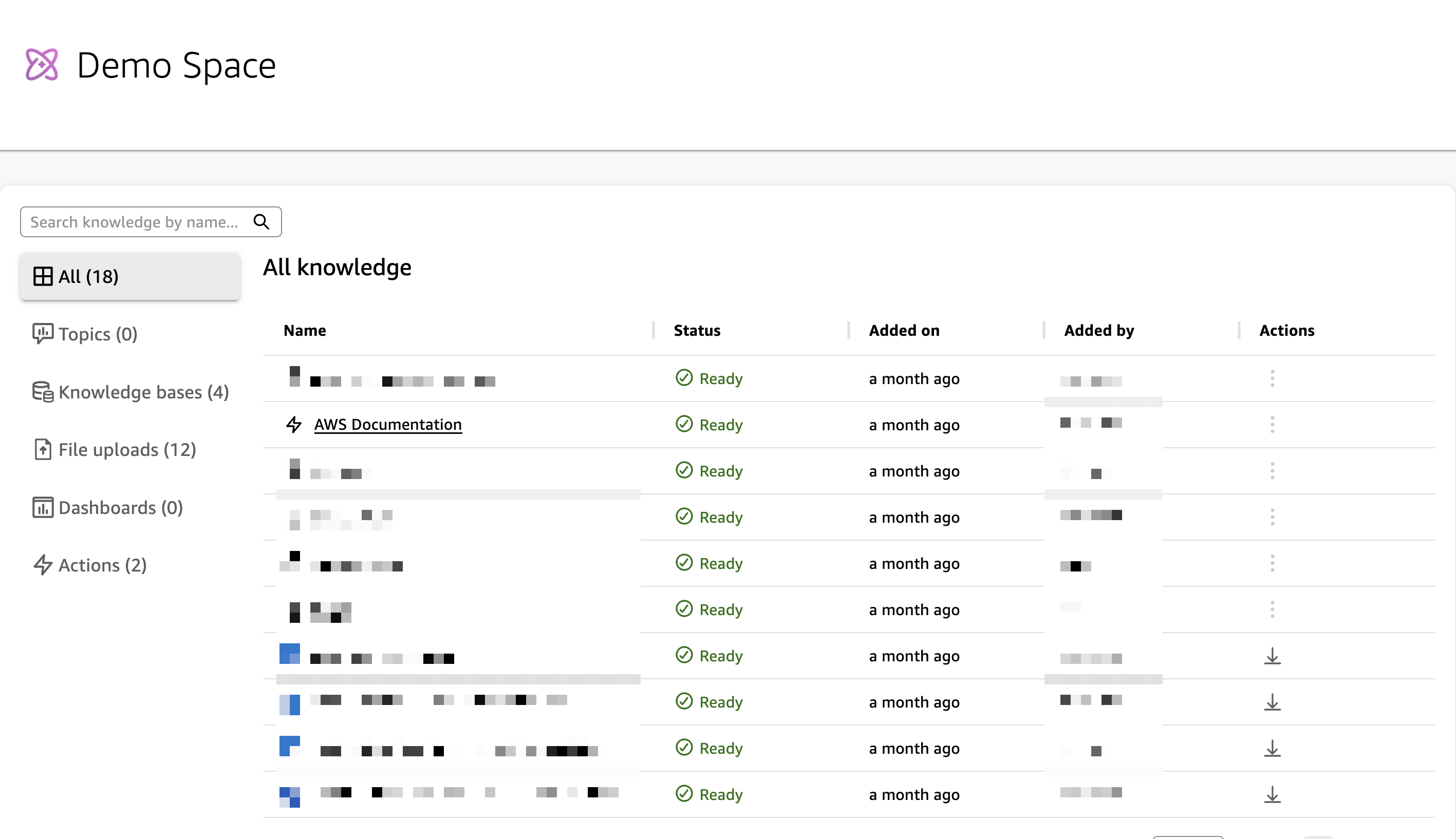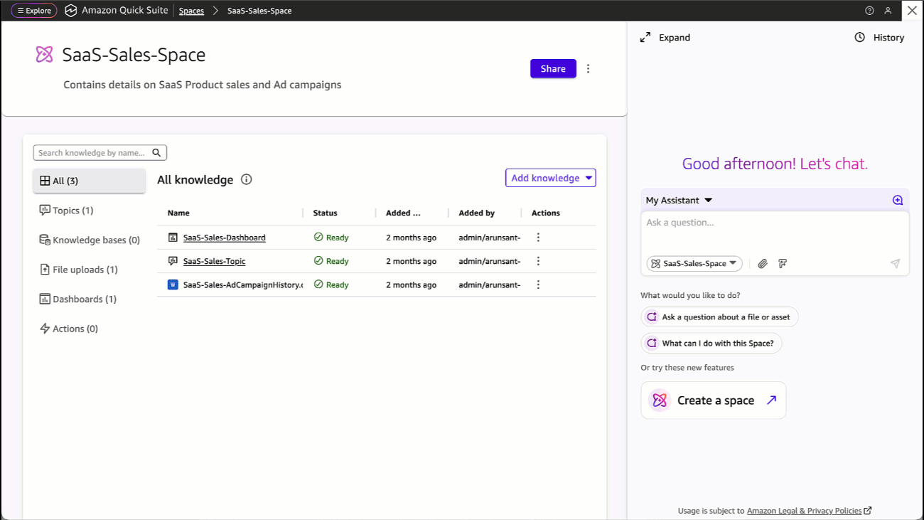 Espacios – Los espacios proporcionan una manera sencilla para que cada usuario empresarial agregue su propio contexto cargando archivos o conectándose a conjuntos de datos y repositorios específicos para su trabajo o para una función particular. Por ejemplo, puede crear un espacio para la planificación trimestral que incluya hojas de cálculo presupuestarias, informes de investigación de mercado y documentos de planificación estratégica. O podría configurar un espacio de lanzamiento de producto que se conecte a su sistema de gestión de proyectos y a las bases de datos de comentarios de los clientes. Los espacios pueden escalar desde uso personal hasta implementación en toda la empresa mientras mantienen los permisos de acceso y la integración perfecta con las capacidades de Quick Suite.