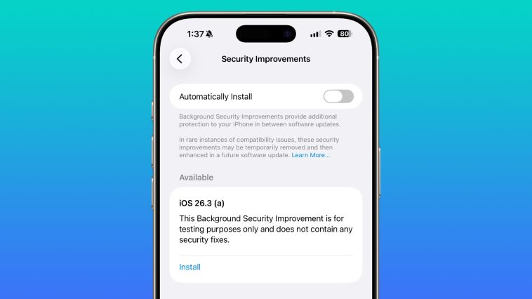 Apple está probando una función de mejora de la seguridad en segundo plano que se implementó por primera vez en iOS 26.1, iPadOS 26.1 y macOS Tahoe 26.1. Los desarrolladores y probadores beta públicos que ejecutan iOS 26.3, iPadOS 26.3 o macOS Tahoe 26.3 pueden instalar una nueva actualización de mejora de seguridad en segundo plano con fines de prueba.