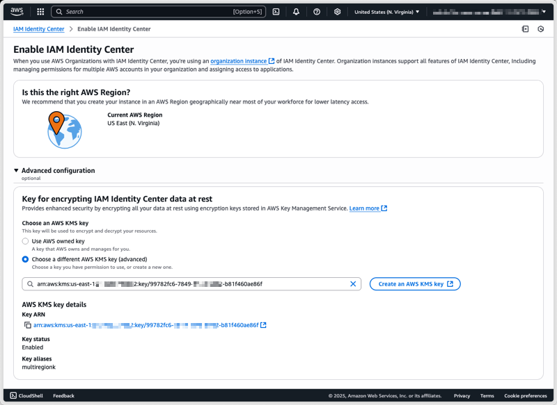 La clave debe estar en la misma región de AWS y cuenta de AWS que la instancia de Identity Center. Debe crear la instancia de Identity Center y la clave en la cuenta de gestión de su organización dentro de la organización AWS.