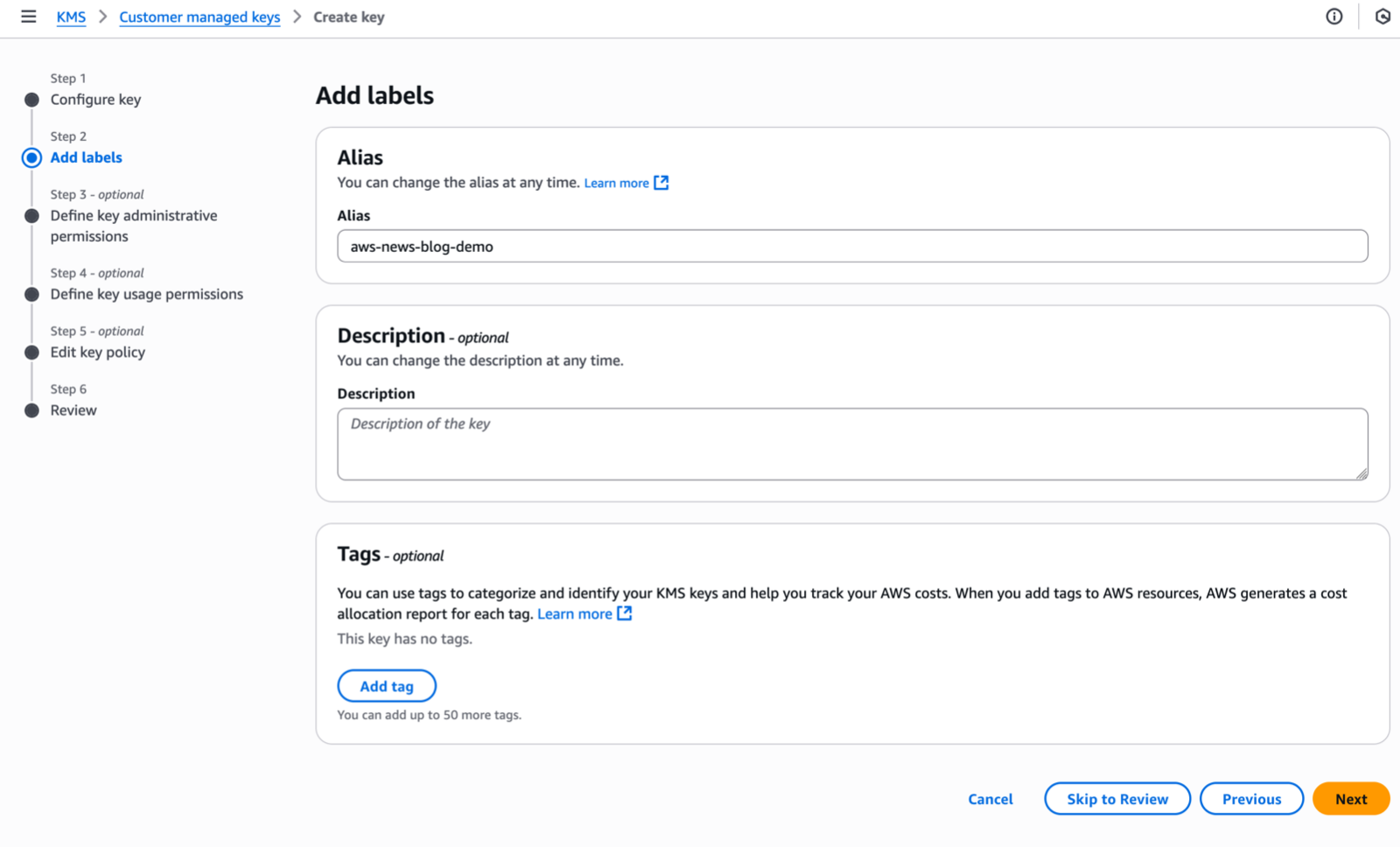 Entonces, elijo Próximo Para continuar con pasos de configuración adicionales, como agregar etiquetas, definir permisos administrativos, configurar los permisos de uso y revisar la configuración final antes de crear la clave.