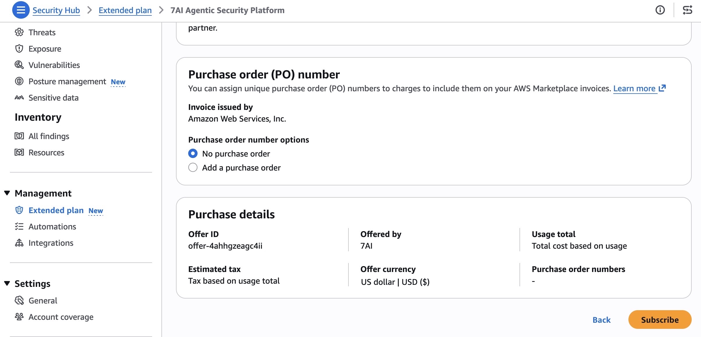 Puede revisar los detalles de la oferta de cada socio directamente en la consola de Security Hub y suscribirse. Cuando se suscriba, será dirigido a una experiencia de incorporación automatizada de cada socio. Una vez incorporado, la medición basada en el consumo es automática y se le factura mensualmente como parte de su factura de Security Hub.
