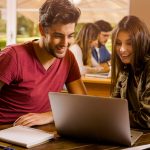 Dos adultos jóvenes sonriendo y mirando una computadora portátil juntos en un entorno interior brillante e informal.