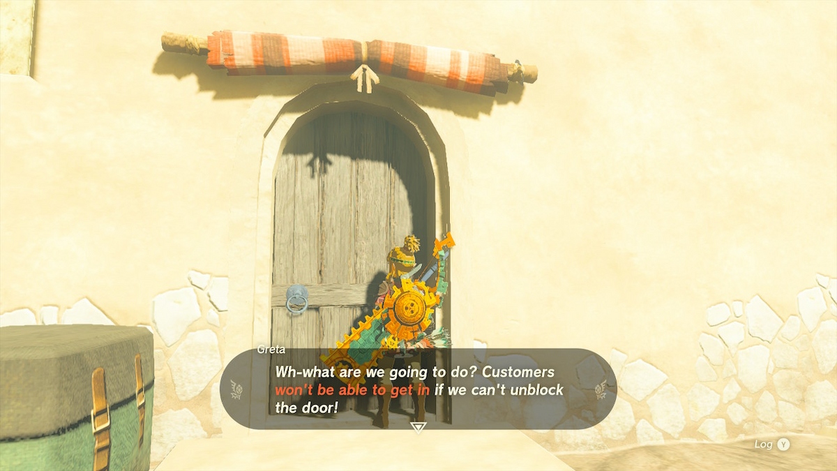 Una vez hecho esto, la tormenta de arena se desvanece y Gerudo Town vuelve a estar en movimiento. Ahora puede visitar tiendas que antes no estaban disponibles. Pero hay una cosa más que debes hacer antes de tener acceso a estas botas de arena y nieve. La tienda de ropa secreta, como en Aliento de lo salvaje, no está abierto para todos. En el último juego, tenías que averiguar el código de acceso para entrar. Pero ahora en Lágrimas del Reinouna caja bloquea la entrada lateral de la tienda.