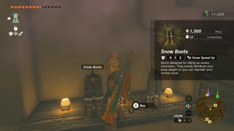 Al igual que en Aliento de lo salvajecómo caminas más rápido en la arena y la nieve en Lágrimas del Reino es usando Sand Boots y Snow Boots. Por supuesto, puedes tomar algunos elixires apresurados, pero eso puede volverse molesto después de un tiempo. En cambio, puedes comprar ambas botas en Gerudo Town.