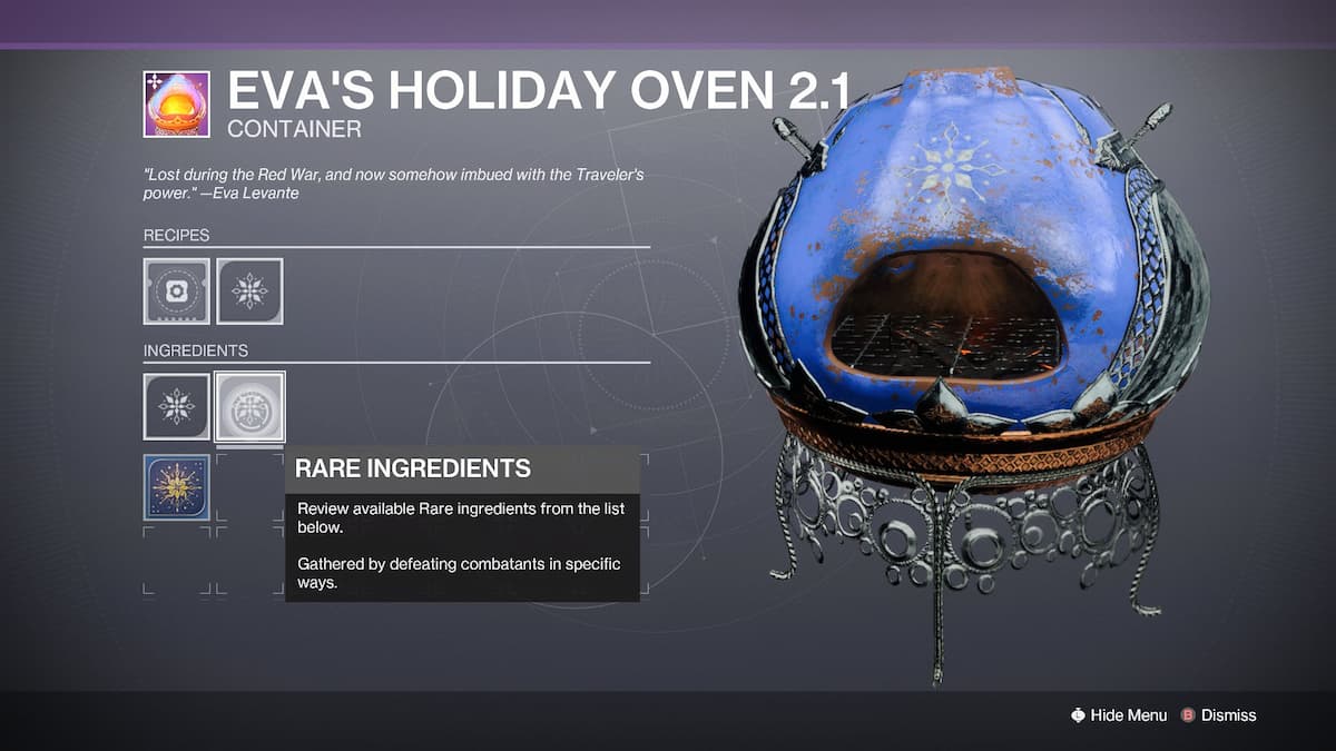 Ningún evento de temporada en destino 2 es lo mismo, y cada uno tiene la tarea de diferentes objetivos trayendo algo nuevo a destino 2. El Festival de los Perdidos trae los sectores embrujados, The Guardian Games trae actividades PvP y The Dawning trae el horno de Eva para hornear galletas. Antes de que los guardianes puedan comenzar el proceso de elaboración de galletas, tendrán que cultivar algunos ingredientes antes de hornear las galletas específicas, incluido el sabor perfecto del ingrediente.