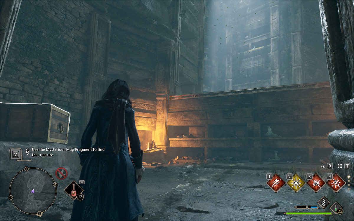 Con el Inferi eliminado, la habitación tiene los escalones de piedra del mapa en el medio, así como un cofre en la repisa izquierda. Aquí es donde el símbolo de Flipendo en el medio se hace evidente: tienes que Flipendo las rocas específicas delineadas con una flecha. Al hacerlo, se mostrará que todos tienen una flecha en el otro lado; se recomienda hacer clic con el botón derecho en la orientación para obtener exactamente el paso que desea voltear. Comience en el lado suroeste, de modo que las flechas apunten hacia la derecha. Si se hace correctamente, la parte inferior izquierda y derecha, y la parte superior central deben estar volteadas. Aparece un cofre.