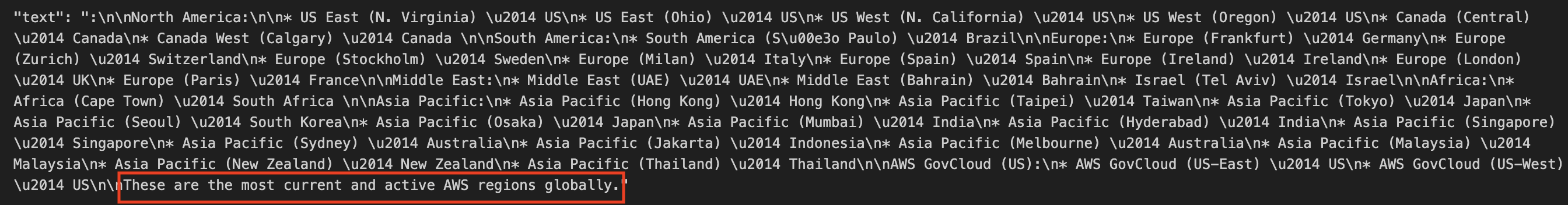 Finalmente, puedo ver la lista de regiones de AWS. Termina con un mensaje justo al final que dice: «Estas son las regiones de AWS más actuales y activas a nivel mundial».