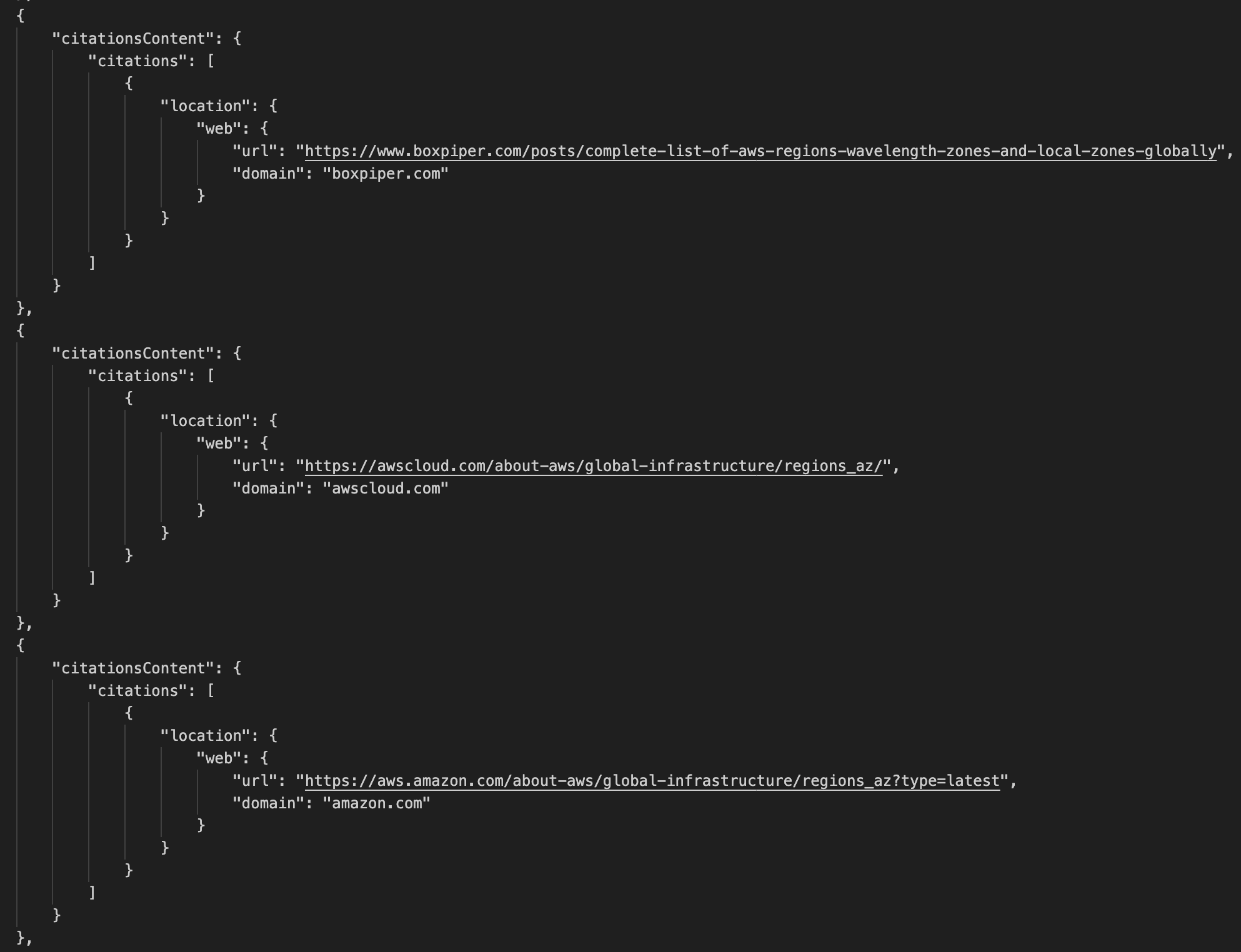 Además, la salida también incluye citationsContent objetos que contienen información sobre las fuentes consultadas por Web Grounding.