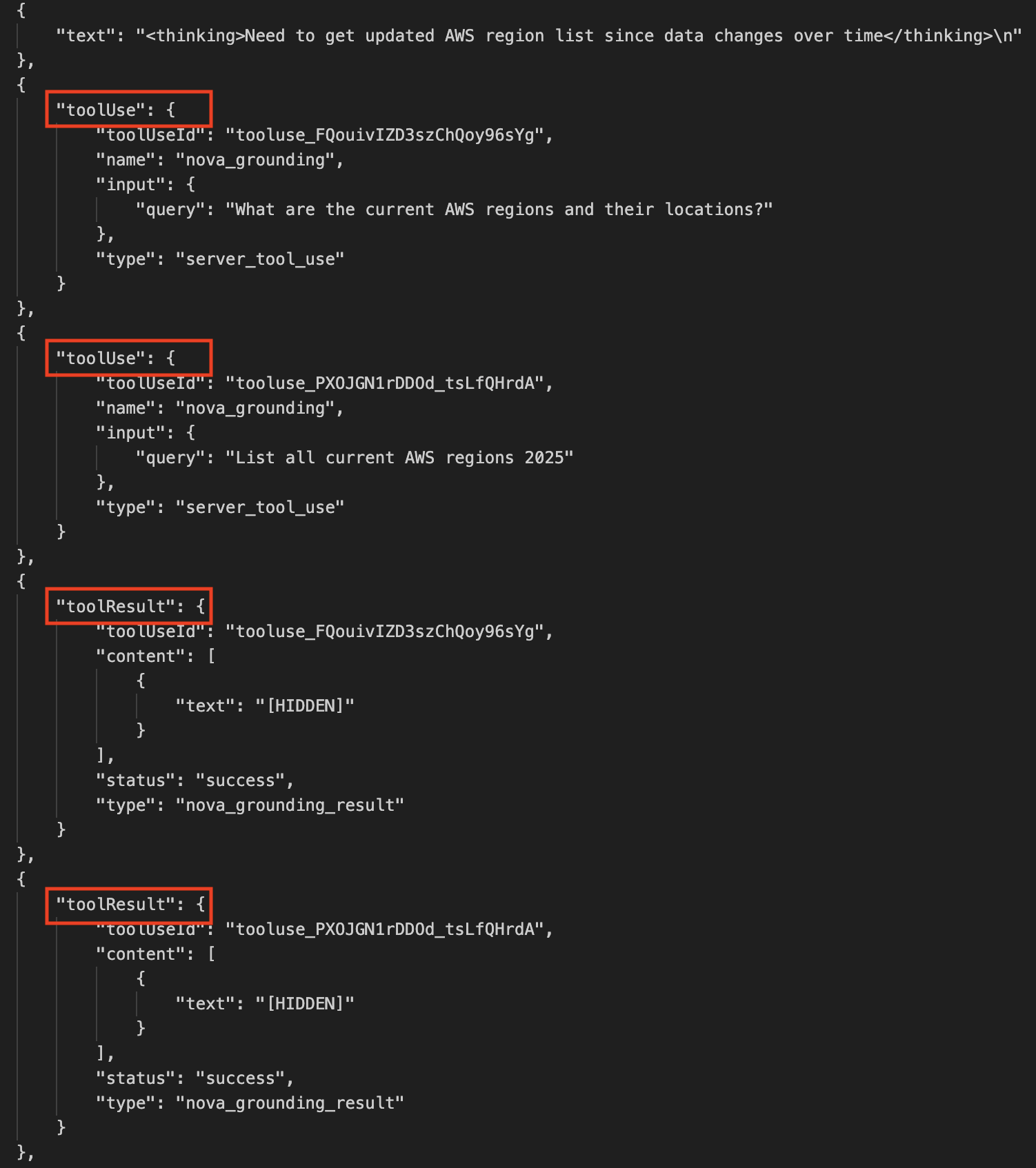 Ahora usemos Web Grounding. Hago una llamada similar a la API de Amazon Bedrock Converse, pero declaro nova_grounding como una de las herramientas de las que dispone el modelo.