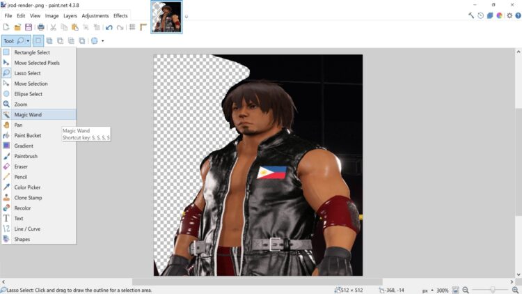 Todo lo que tienes que hacer es usar la herramienta Varita mágica para eliminar el fondo, manteniendo solo la figura del luchador en el lienzo. Si tomó una captura de pantalla en el juego, es posible que también deba usar la herramienta Lazo.