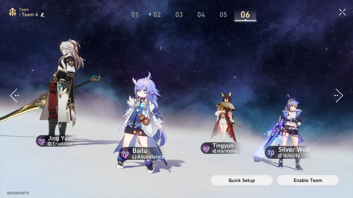 - Mono-Equipos: “Mono-equipos” se refiere a equipos que consisten principalmente en un elemento. Por ejemplo, Jing Yuan podría ejecutarse con Bailu y Tingyun, que son personajes eléctricos. Una desventaja importante de este equipo suele ser la falta de elementos, lo que significa que naturalmente tendrás algunos problemas para romper las debilidades del enemigo. En general, desea un equipo con más elementos, por lo que tiene una mayor variedad de habilidades para romper debilidades. Afortunadamente, Silver Wolf resuelve este problema, lo que permite que tu equipo rompa las debilidades de los jefes que no son débiles en sus elementos naturales.