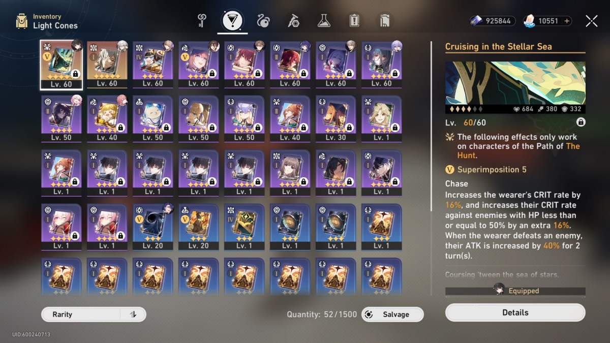- Navegando en el Mar Estelar: Afortunadamente para los personajes de Hunt, hay un cono de luz de camino de caza de 5 estrellas que puedes obtener en la tienda de Herta en el universo simulado. Esta arma es Cruising in the Stellar Sea y, como arma gratuita, es bastante fácil invertir en ella. Con los refinamientos máximos, esta arma aumenta la tasa de críticos del usuario en un 16 %, hasta un 16 % adicional en enemigos con menos del 50% de HP. Además, cuando el usuario derrote a un enemigo, recibirá un beneficio de 40% ATK durante 2 turnos. Esta es un arma fuerte puramente para aumentar las estadísticas y es una excelente opción para Sushang como una opción de juego gratuito.