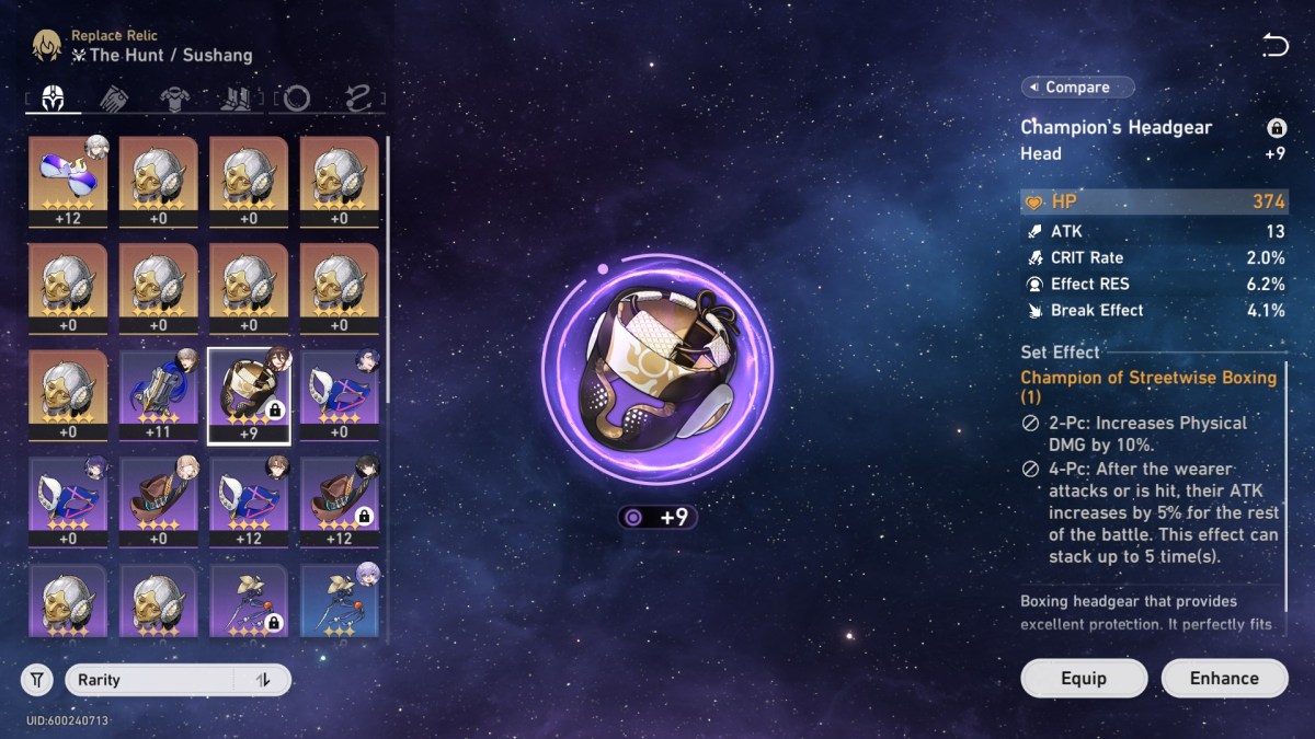 - Para su juego de 4 piezas, querrá invertir en el Campeón de Streetwise Boxing colocar. Este conjunto aumenta el DAÑO físico de Sushang en un 10 % y aumenta su ATQ en un 5 % cada vez que golpea a un enemigo o recibe un golpe, hasta 5 veces. Esta es una opción fácil para Sushang, ya que desea el aumento de DMG físico y un beneficio de ATK máximo del 25%.