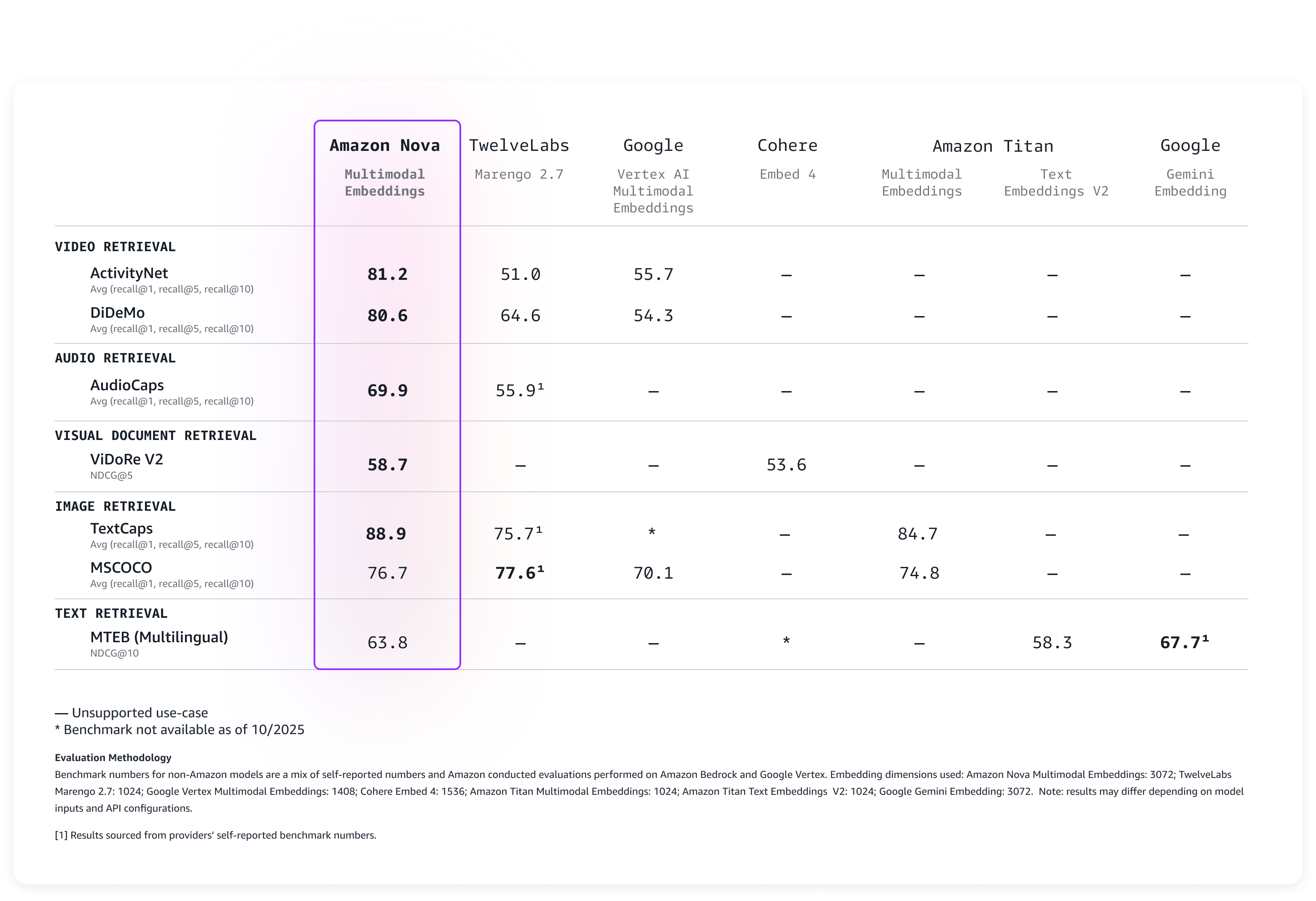 Hoy presentamos Amazon Nova Multimodal Embeddings, un modelo de incorporación multimodal de última generación para aplicaciones de búsqueda semántica y de generación aumentada de recuperación agente (RAG), disponible en Amazon Bedrock. Es el primer modelo de incrustación unificado que admite texto, documentos, imágenes, video y audio a través de un único modelo para permitir la recuperación intermodal con una precisión líder.
