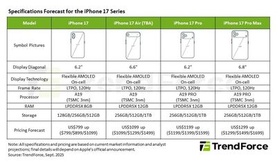 El próximo Air del iPhone 17 de Apple tendrá un precio inicial de $ 1,099 que proporciona 256 GB de almacenamiento base y máximo alcanzará $ 1,499 con una opción de 1 TB, según la última Informe de Trendforce.