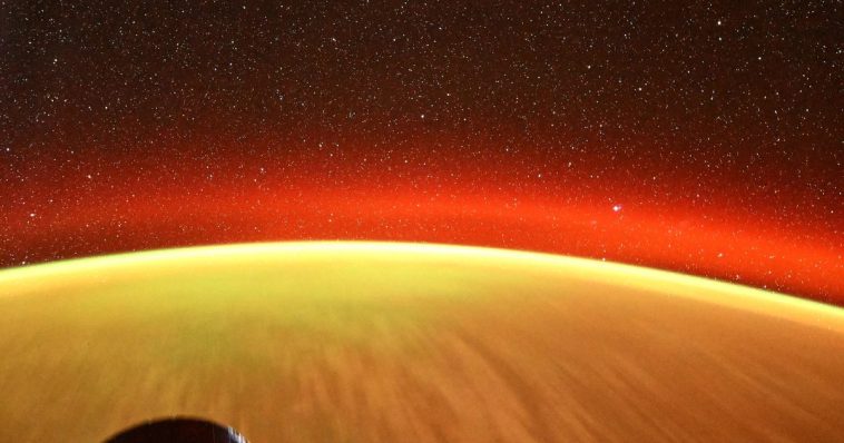Tomada durante su reciente misión de siete meses a bordo del puesto orbital, la asombrosa imagen muestra un resplandor de aire sobre el planeta que llamamos hogar, junto con estrellas distantes y una parte de una nave espacial SpaceX Dragon atracada en la estación.