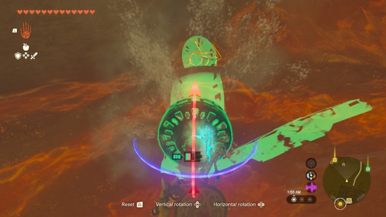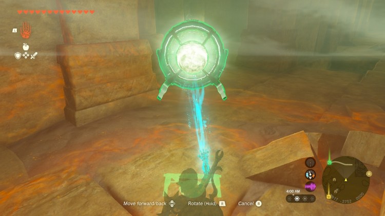 Una vez que tengas un espejo, use Ultrahand para levantarlo y reflejar la luz contra los dos hexágonos naranjas a cada lado de la pared. Después de un tiempo, debería activarse, permitiéndote abrir una habitación secreta. Si te diriges al de la izquierda, pisa la placa de presión para encontrar un Bubbulfrog.