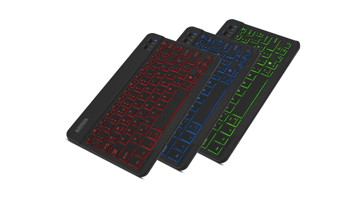 El siguiente es el Arteck HBO30B. Este es un teclado que técnicamente está diseñado para tabletas y otros dispositivos pequeños, pero eso no significa que no pueda funcionar para una PC. Y si solo necesita algo silencioso para usar por la noche, esta podría ser una opción inteligente. También es inalámbrico a través de Bluetooth, por lo que puede usarlo para mucho más que solo su PC. Incluso tiene una retroiluminación LED con una selección de siete colores. Con todo, no está mal para un pequeño teclado. Nuevamente, esta sigue siendo una opción bastante económica, pero buena para aquellos que solo quieren un teclado silencioso para ciertas situaciones.