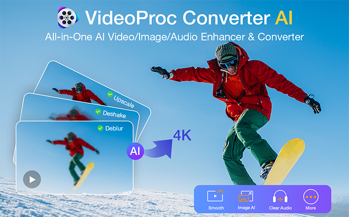 VideoProc Converter AI es un kit de escritorio creado para mejorar, convertir y comprimir medios con IA, mientras maneja fácilmente tareas cotidianas como descargar y grabar. Sus funciones de IA, que incluyen superresolución, estabilización e interpolación de fotogramas, son clave para transformar el metraje original en archivos limpios y de alta fidelidad para una línea de tiempo profesional en 4K.