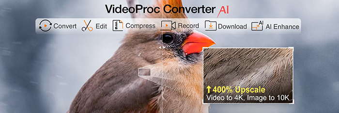 VideoProc Converter AI soluciona problemas comunes de los medios, como fotos borrosas o ruidosas con configuraciones ISO altas, pérdida de detalles después del recorte, clips inestables de cámaras portátiles y archivos de gran tamaño que son difíciles de administrar. Este todo en uno potenciador de medios y el conversor combina funciones de mejora, conversión, compresión y grabación de imágenes y videos en una sola interfaz, con aceleración total de GPU para un procesamiento rápido de fotografías de alta resolución de 8K/10K y videos de 4K.