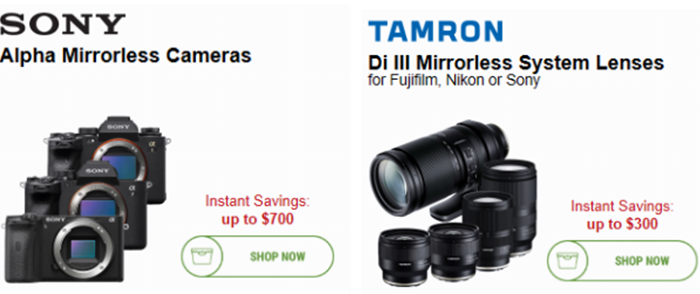 tenemos nuevos hasta $700 de descuento en equipos Sonynuevo hasta $300 en lentes Tamron y nuevo hasta $300 de descuento en productos Apple.