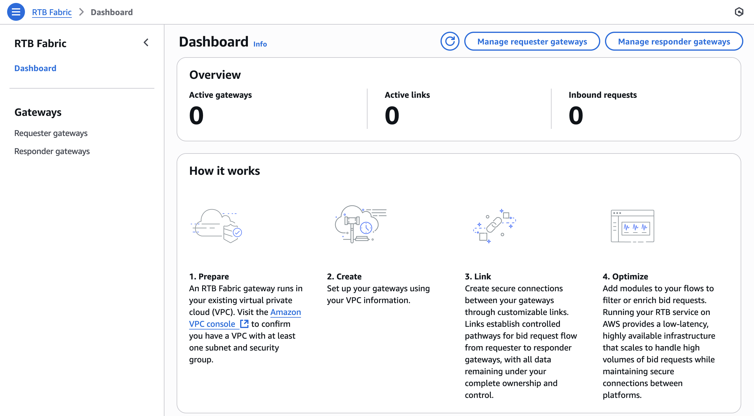 La consola proporciona un punto de entrada visual para ver y administrar puertas de enlace y enlaces RTB, como se muestra en la Panel de la consola de AWS RTB Fabric.