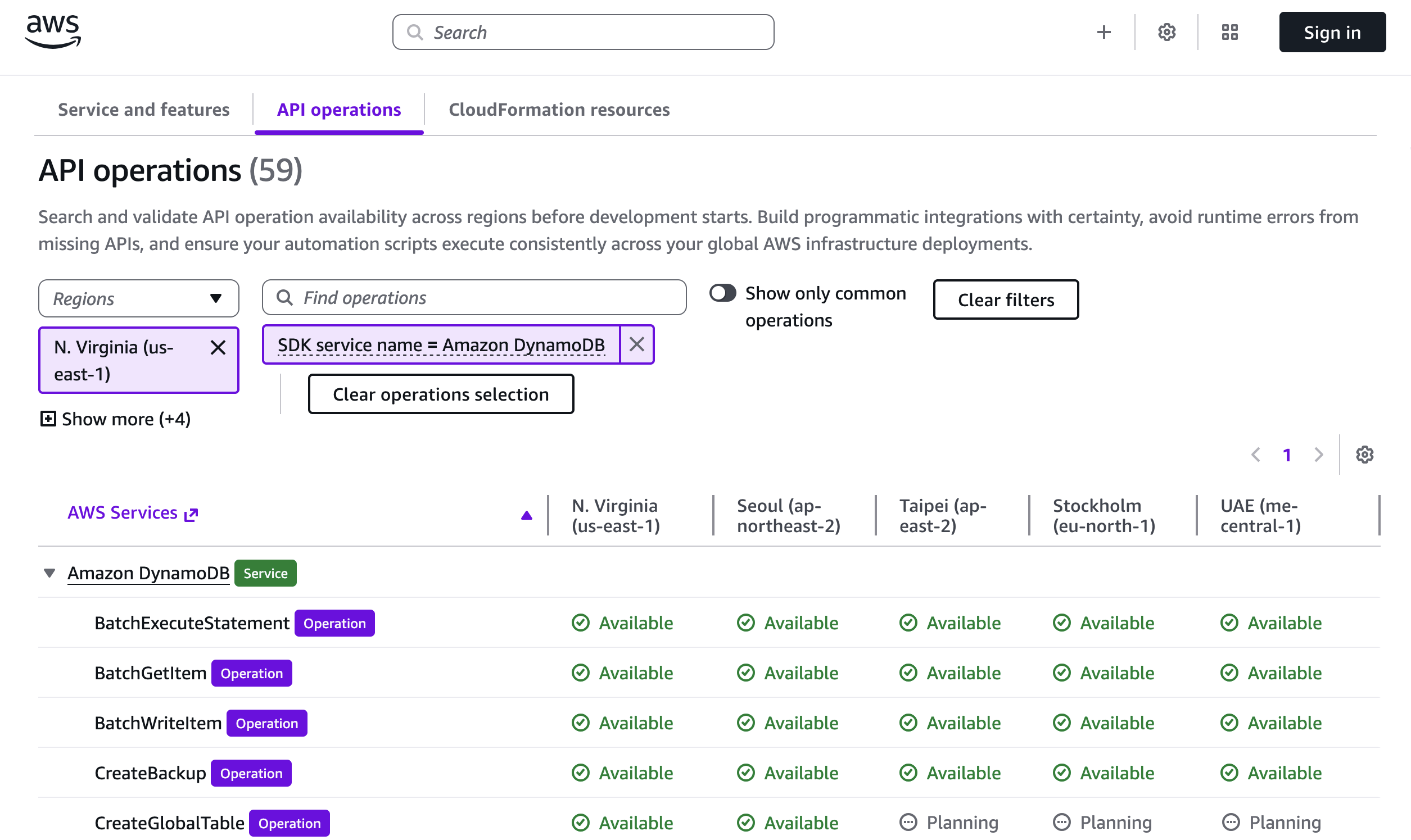 Además de explorar servicios y características, las capacidades de AWS por región también lo ayudan a explorar las API disponibles y los recursos de CloudFormation. Como ejemplo, para explorar Operaciones APIagregué las regiones de Europa (Estocolmo) y Medio Oriente (EAU) para comparar las características de Amazon DynamoDB en diferentes geografías. La herramienta le permite ver y buscar la disponibilidad de operaciones API en cada región.