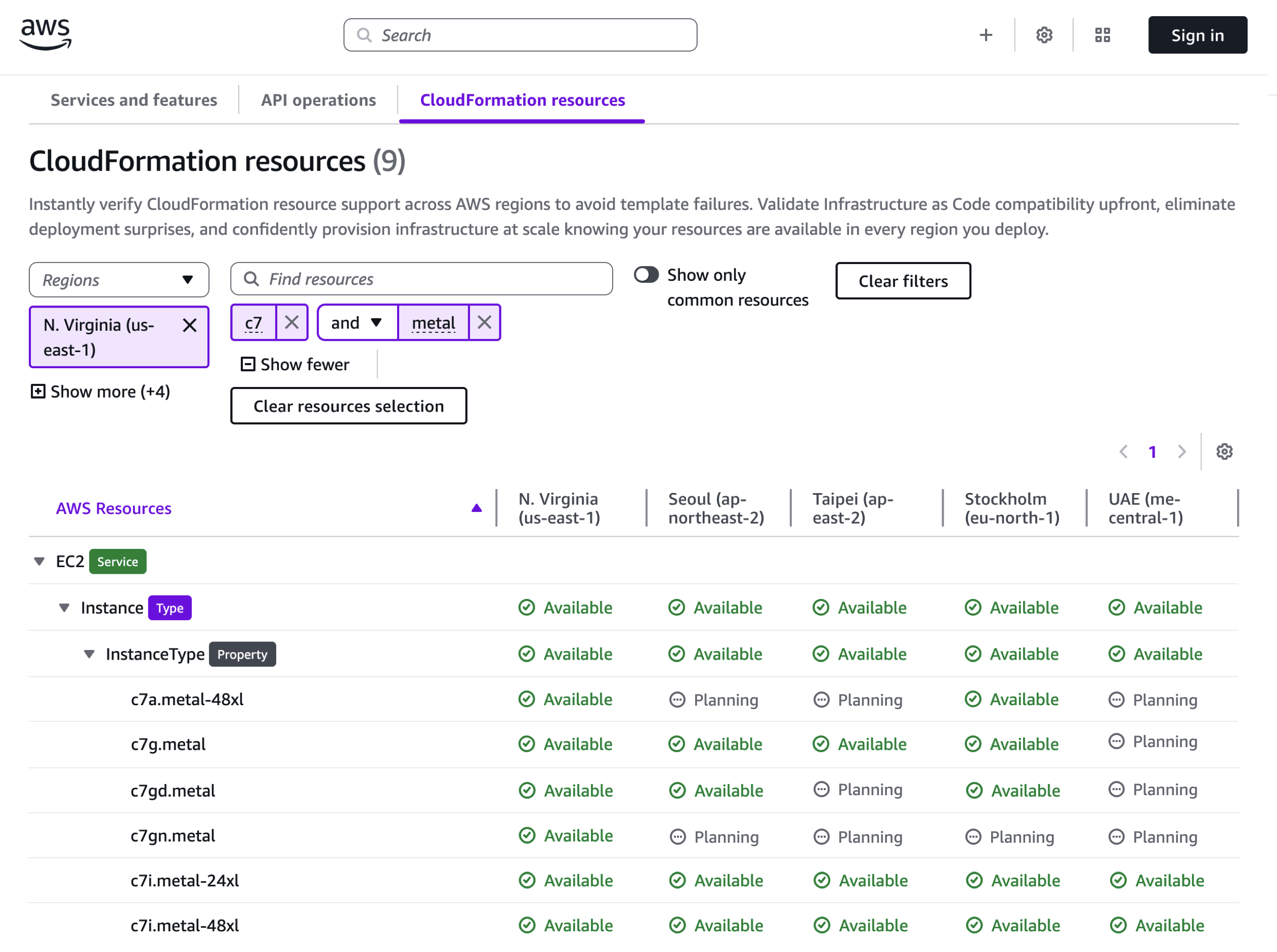También puede buscar recursos detallados, como la disponibilidad de tipos de instancias de Amazon Elastic Compute Cloud (Amazon EC2), incluidas instancias especializadas como variantes basadas en Graviton, habilitadas para GPU y optimizadas para memoria. Por ejemplo, busqué instancias metálicas optimizadas para computación de séptima generación y pude encontrar c7i.metal-24xl y c7i.metal-48xl Las instancias están disponibles en todas las regiones de destino.