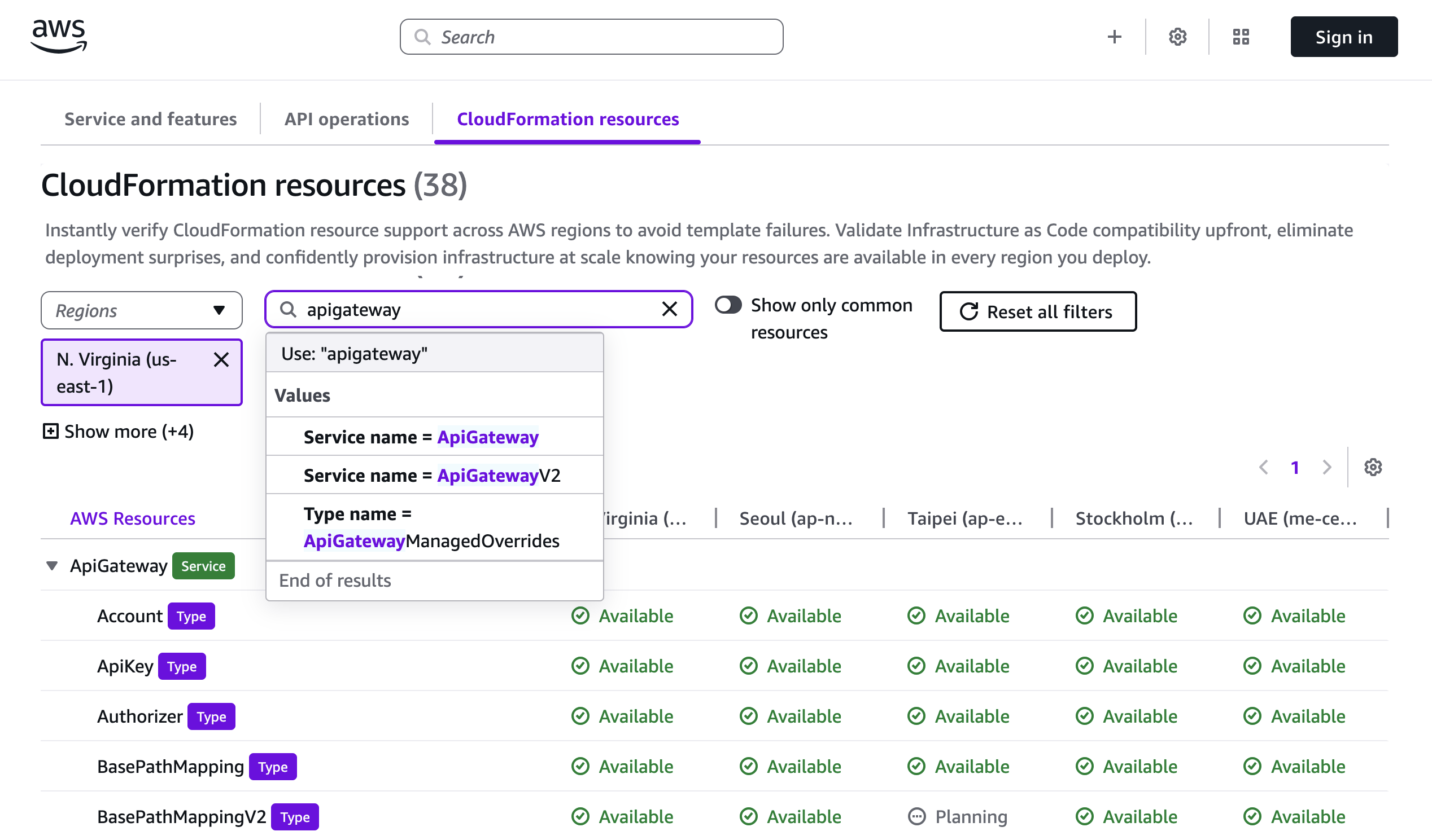 El Recursos de formación en la nube La pestaña le ayuda a verificar el soporte regional para tipos de recursos específicos antes de escribir sus plantillas. Puedes buscar por Service, Type, Propertyy Config.Por ejemplo, al planificar una implementación de Amazon API Gateway, puede verificar la disponibilidad de tipos de recursos como AWS::ApiGateway::Account.