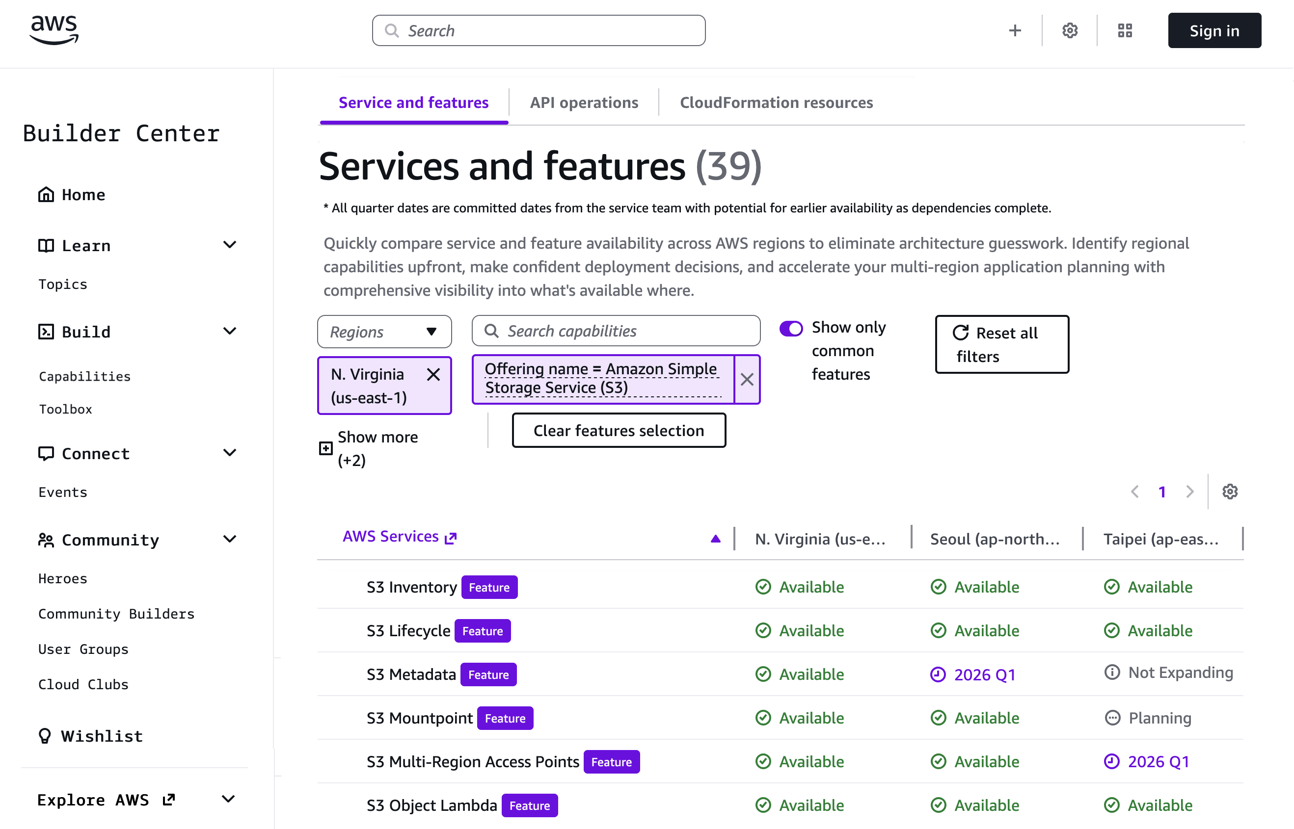 Para comenzar, vaya a Centro de creación de AWS y elige Capacidades de AWS y Comience a explorar. Cuando seleccionas Servicios y característicaspuede elegir las regiones de AWS que más le interesen en la lista desplegable. Puede utilizar el cuadro de búsqueda para encontrar rápidamente servicios o funciones específicas. Por ejemplo, elegí las regiones de EE. UU. (Norte de Virginia), Asia Pacífico (Seúl) y Asia Pacífico (Taipei) para comparar las características de Amazon Simple Storage Service (Amazon S3).