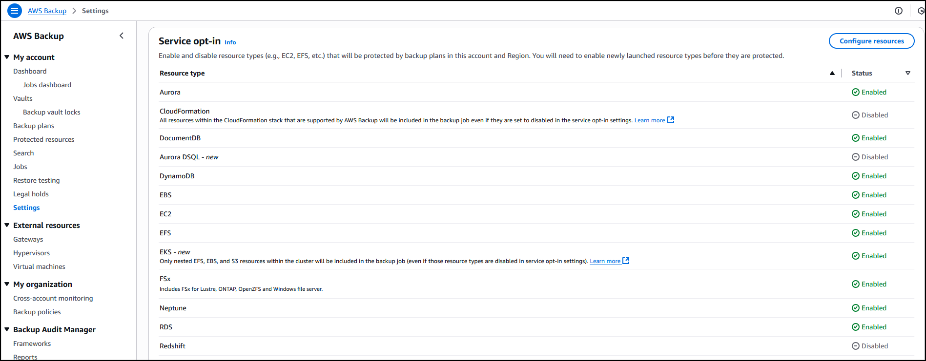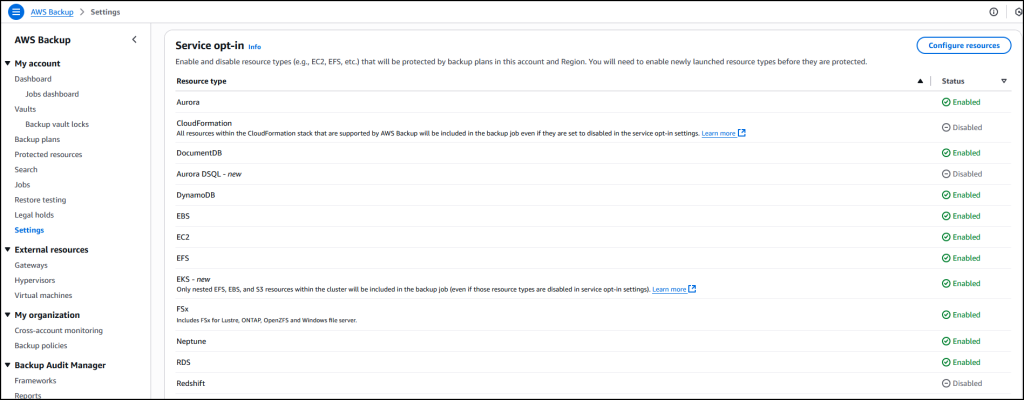 En la consola de AWS Backup, en el panel de navegación izquierdo, elijo Ajustes y luego Configurar recursos para optar por habilitar la protección de los clústeres de EKS en AWS Backup.