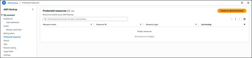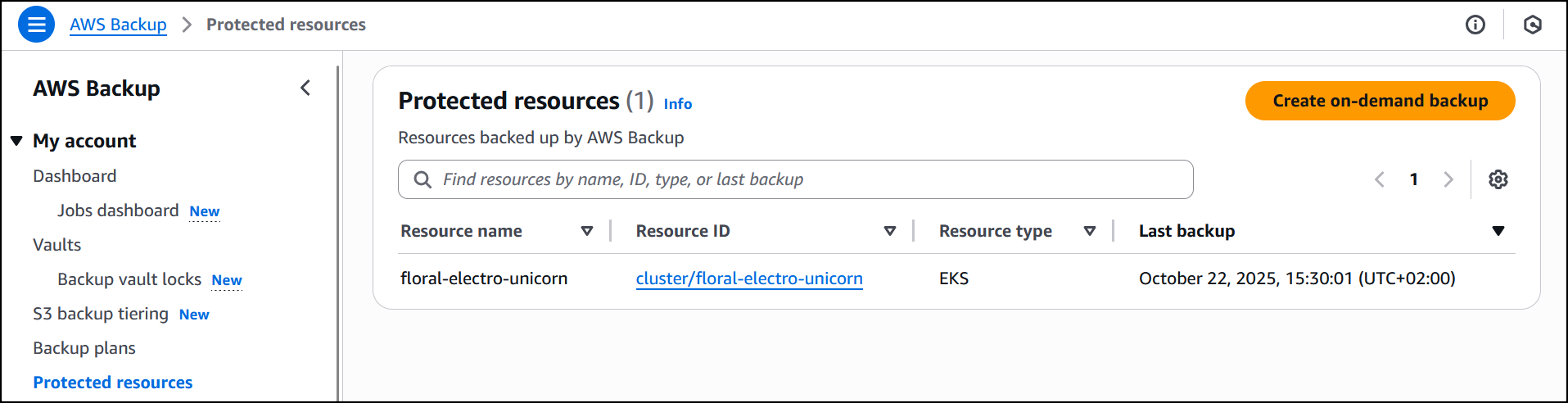 Ahora que he habilitado Amazon EKS, en Recursos protegidos yo elijo Crear copia de seguridad bajo demanda para crear una copia de seguridad para mi clúster EKS ya existente floral-electro-unicorn.