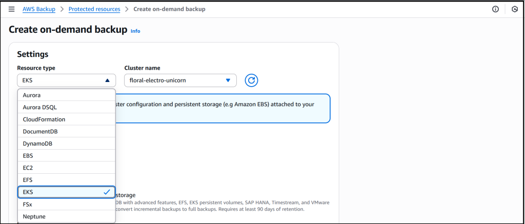 Habilitar EKS en Configuración garantiza que aparezca como un Tipo de recurso cuando creo una copia de seguridad bajo demanda para el clúster EKS. Procedo a seleccionar el tipo de recurso EKS y el cluster.