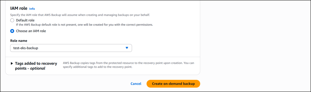 Dejo el resto de la información por defecto, luego selecciono Elija un rol de IAM para seleccionar un rol (test-eks-backup) que he creado y personalizado con los permisos necesarios para que AWS Backup los asuma al crear y administrar copias de seguridad en mi nombre. yo elijo Crear copia de seguridad bajo demanda para finalizar el proceso.