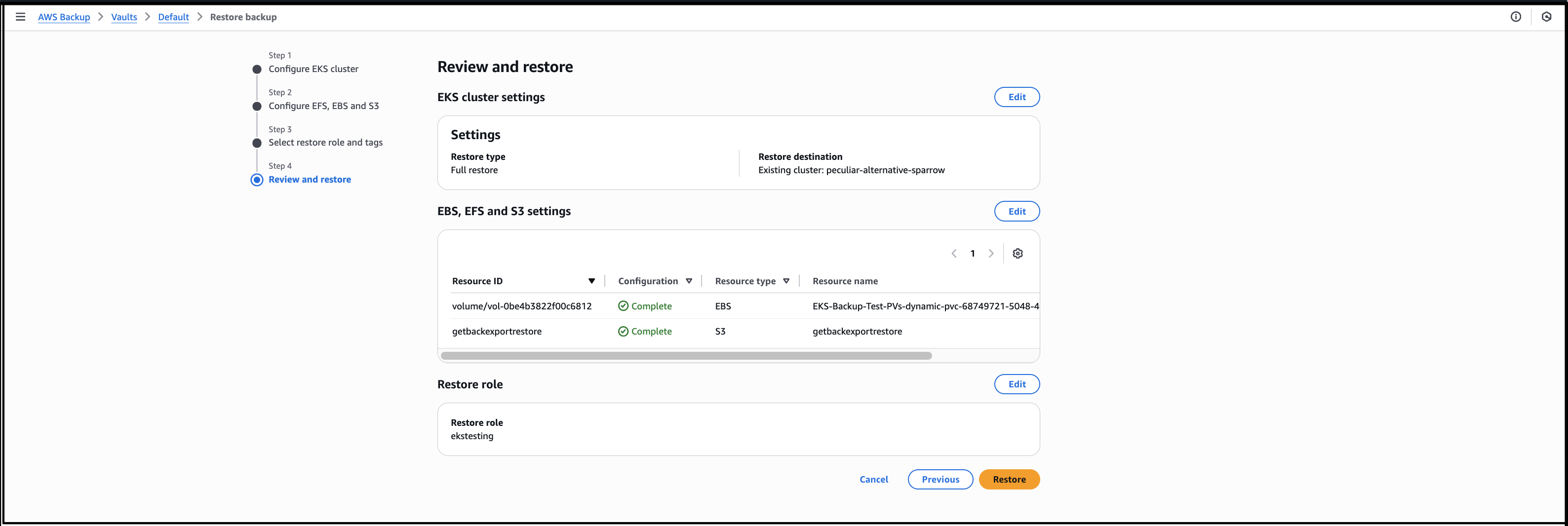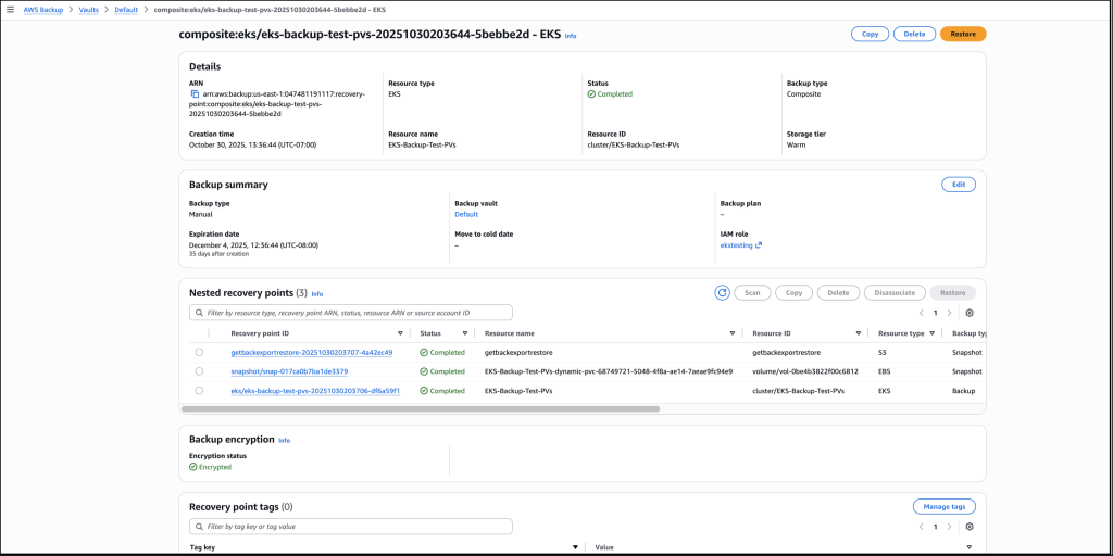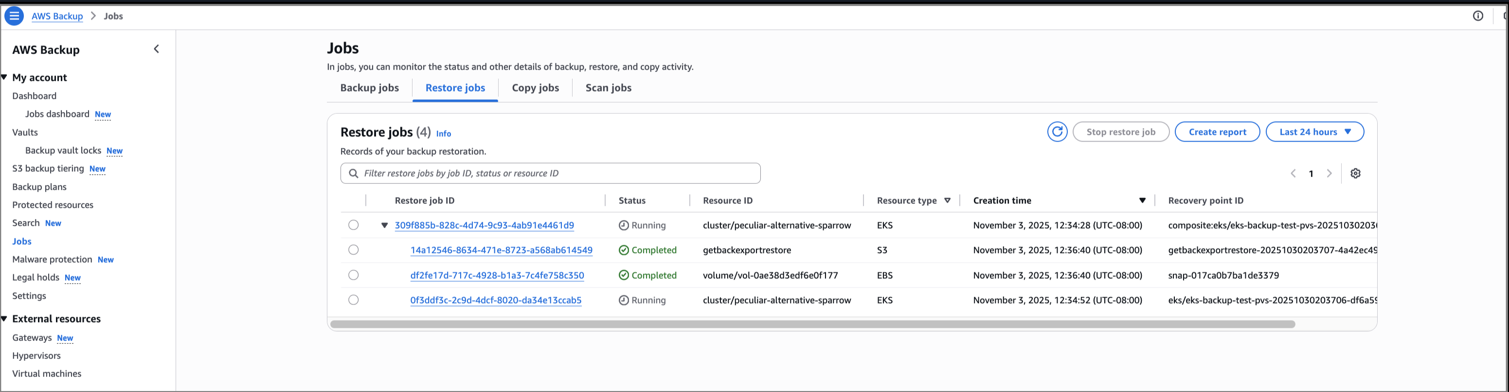 Al seleccionar la flecha desplegable se obtienen detalles del estado de restauración tanto para el estado del clúster EKS como para los volúmenes persistentes conectados. En este tutorial, todos los puntos de recuperación individuales se restauran exitosamente. Si algunas partes de la copia de seguridad fallan, es posible restaurar los almacenes persistentes respaldados correctamente (por ejemplo, volúmenes de Amazon EBS) y los ajustes de configuración del clúster de forma individual. Sin embargo, no es posible restaurar la copia de seguridad completa de EKS. Los recursos respaldados exitosamente estarán disponibles para restauración, listados como puntos de recuperación anidados en el punto de recuperación del clúster EKS. Si hay una falla parcial, habrá una notificación de las partes que fallaron.