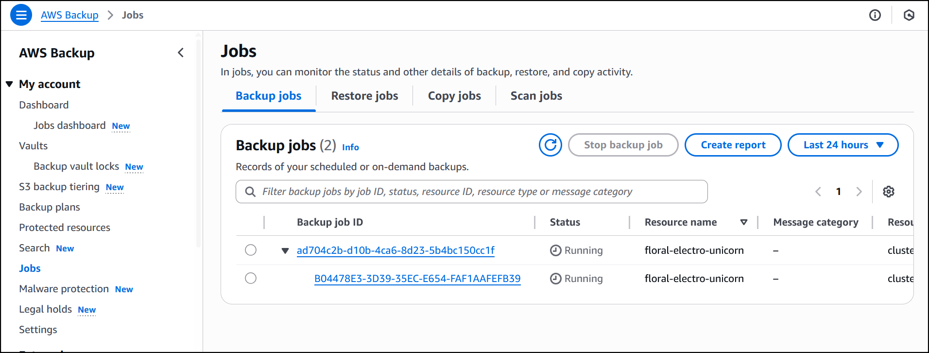 El trabajo se completó con éxito y ahora el clúster EKSfloral-electro-unicorn está respaldado por AWS Backup.
