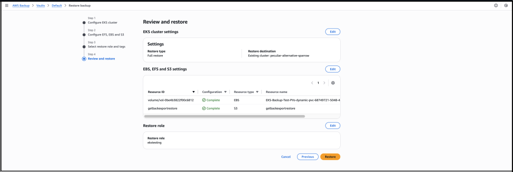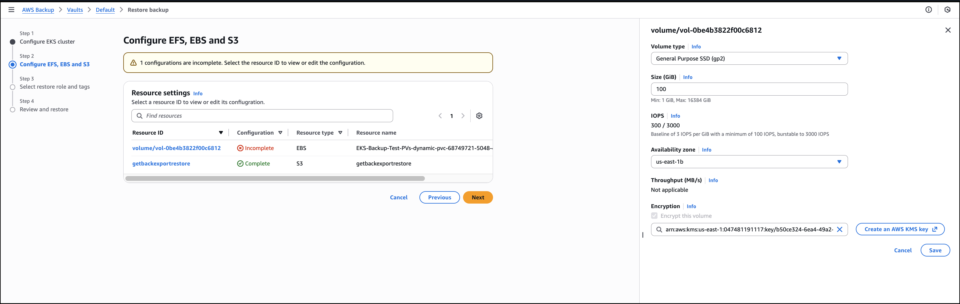 Luego configuro la restauración de los recursos de almacenamiento persistentes, que se restaurarán junto con mis clústeres EKS.