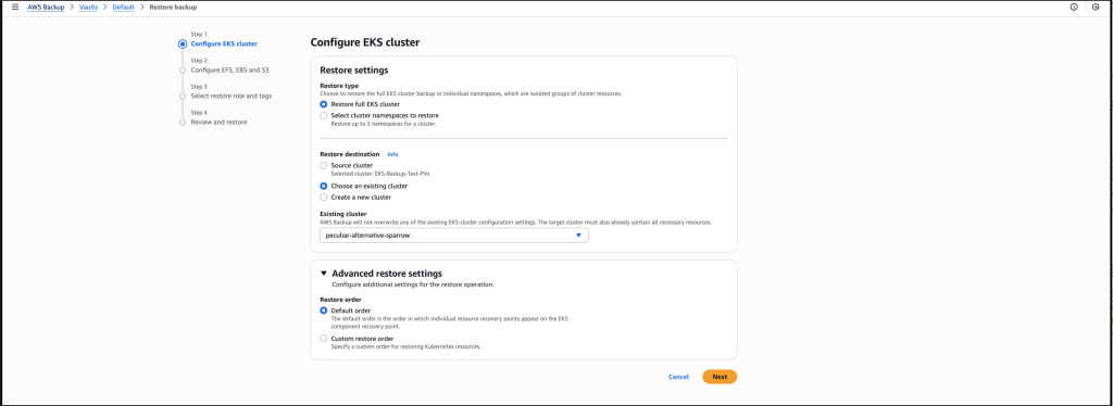 yo elijo Restaurar el clúster EKS completo para restaurar la copia de seguridad completa de EKS. Para restaurar a un clúster existente, yo Elija un clúster existente luego seleccione el clúster de la lista desplegable. elijo el Orden predeterminado como el orden en el que se restaurarán los recursos individuales de Kubernetes.
