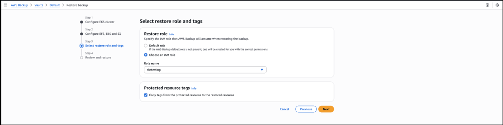 A continuación, yo Elija un rol de IAM para ejecutar la acción de restauración. El Etiquetas de recursos protegidos La casilla de verificación está seleccionada de forma predeterminada y la dejaré como está, luego elegiré Próximo.