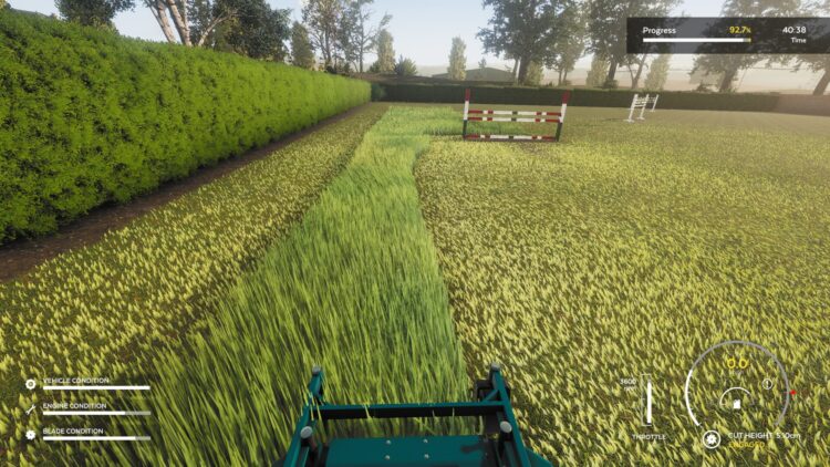 Su otro obstáculo más grande es la longitud del césped. Si bien no está nada mal al principio, gran parte del césped en Simulador de corte de césped puede ser bastante alto. Si intenta cortarlo a la altura requerida de una vez a toda velocidad, sobrecargará su motor y dejará tiras. Hay dos formas de lidiar con esto: o aumenta la altura de la cuchilla y corta el césped en dos pasadas, o mantiene baja la velocidad con cuidado. Lo primero no es preferible porque requiere que corte de manera efectiva toda el área dos veces, por lo que prefiero reducir mi velocidad.