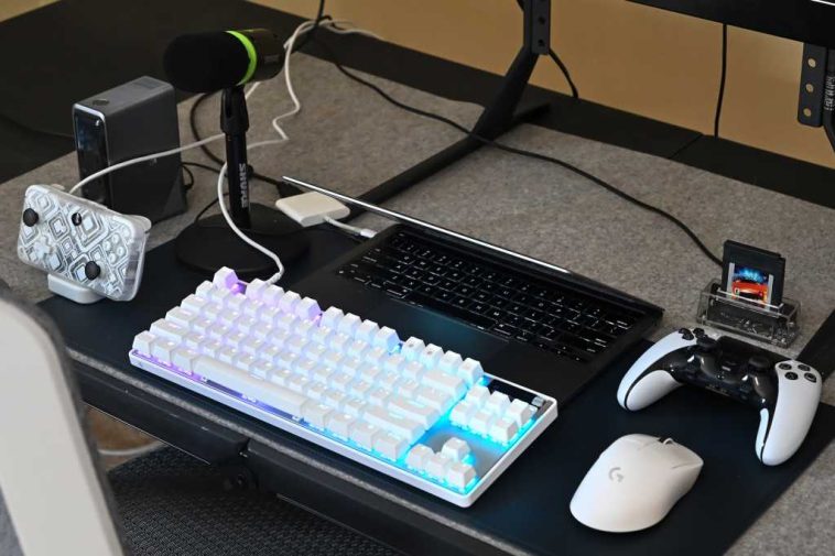 El único desafío de jugar en una MacBook es que pronto te quedarás sin puertos. Y por «pronto» me refiero a casi de inmediato. Todo jugador necesita algo como Estación de acoplamiento de carga Anker Prime ($2270), que tiene una gran cantidad de conexiones USB para carga (compatibles con USB-A y USB-C), transferencia de datos USB (hasta 10 Gbps) e incluso tiene un conector para auriculares adicional. Conecté un teclado, una llave USB para mouse, una unidad SSD y un cable HDMI para una expansión importante.